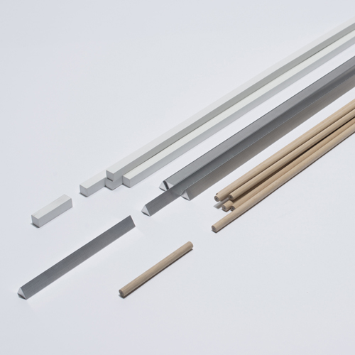 鉛筆は直径8ミリで長さ90センチ。使いたい長さに切ることができますが、「個人的には短く切って握り込むようにスケッチをしたい」と作者の1人である中森大樹さんは言います。「あるいはアンリ・マティスのように長いまま持ってスケッチをしてもいい。木ですから削って握りやすくしたり、自分の刻印を入れたり色をつけたりすることもできます」(中森さん)。消しゴムは1辺12ミリの正方形の断面で、必要な時にちぎって使うことができます。「ほかにも、斜めに切って細かい部分を消すのに用いたり、机の上に転がっているピンを刺しておいても。簡単に切ることができて、角が立っているので、建築模型やスタディにも使えるかもしれません」(中森さん)。そして定規は1辺15ミリの正三角形の断面で、アルミ製です。「1つの面に目盛りが刻まれていますが、別の面には自分で目盛りを刻んで独自の定規をつくってもいい。縦方向に切り込みを入れてカードホルダーとして使うこともできます」と中森さん。ちなみに海老塚さんは、短くカットした定規の中央に穴をあけて紐を通し、「測れるアクセサリー」として身につけていました。