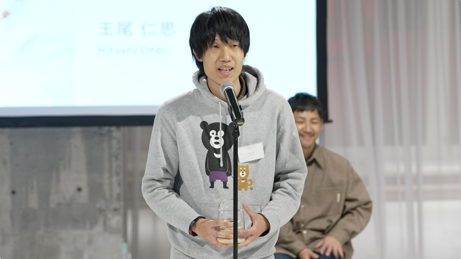 受賞の喜びを語る王尾仁思さん。「(受賞するとは思わず)クマのパーカーを着てきてしまった」と会場の笑いを誘った