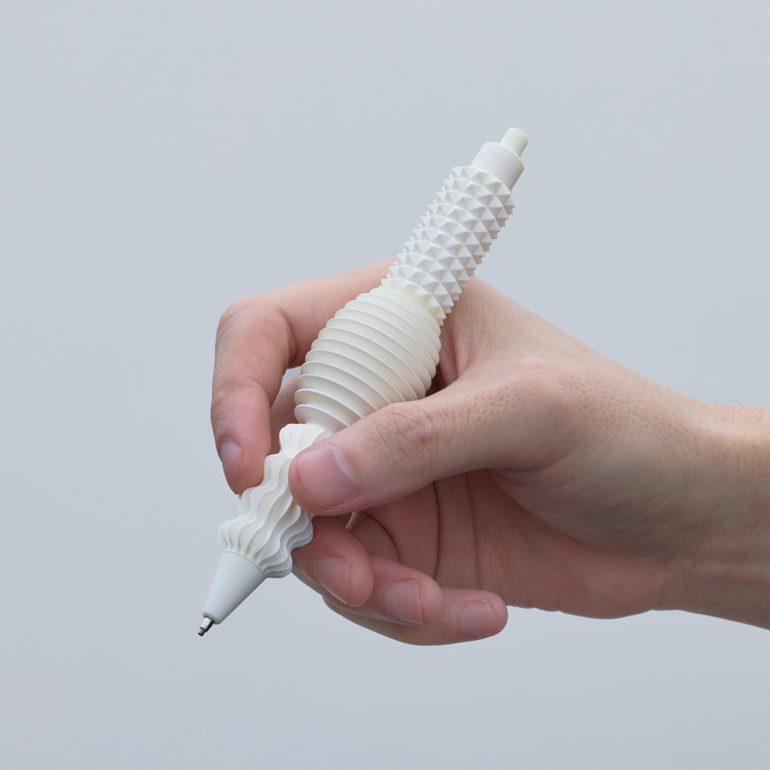 人間の指先には多くの神経が集中しており、指先を刺激すると脳の働きが活性化されます。アイデアを生み出すことをサポートするために、12種のグリップ部分にさまざまな形状の突起を施しました。3Dプリンターでの無数の検証を経て、エッジが立つよう硬いセラミック素材を採用。ペンと呼ぶには異質なため、当初は「美しいとは思えない」「素材などに検討の余地がある」といった厳しい声も。一方、実際に使った審査員は、触ると突起の刺激を実感でき、印象が一変すると指摘します。そこから、神経を起点に触覚から見出した形状という、新しいアプローチが見えてきました。「いかに目に騙されているか。深海魚のようなもの。深海魚には合理性がある」と議論は白熱。やがて新しい何かを生む、未来への可能性を感じると意見はまとまり、グランプリに決定しました。川田さんは受賞後に「触覚や脳が刺激されているかに重きを置き、そこからの美しい造形を目指した。使ううちにペンが動く心地よさを評価されたのはうれしかった」とコメント。今後、どう合理性を深掘りしていけるか、さまざまな余地があるだけに、期待は高まります。