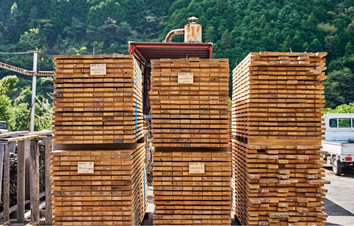 四万十町森林組合では24時間体制で1週間、じっくり時間をかけて強度を高めています。こうした作業が可能な森林組合は、まだ全国でもそう多くはありません。 -