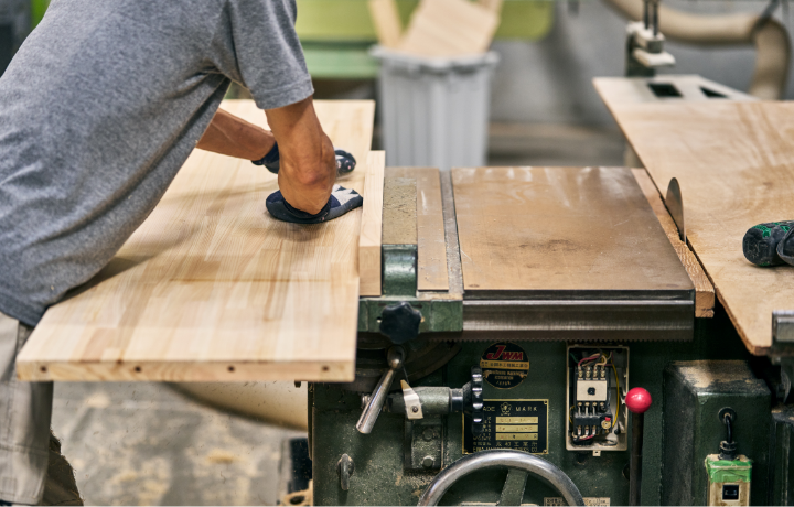 間伐された木は、質の良いものは無垢材になり、そうでないものは厳しい品質管理のもとで加工され、集成材になります。集成材とは断裁した板材を縦横に接合して再構成した木材のこと。手間がかかりますが、その分、大きな節や質の悪い部分を排除できます。また小片の状態で品質を揃えていくため、安定した品質が得られます。集成材は湿度変化による割れ、変形、反りなどが現れにくいことも特長。