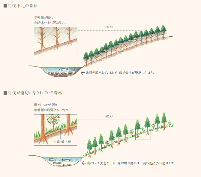 間伐がされていない森では、太陽の光が入らず、下草が育ちません。雨が降った時にクッションの役割をする下草が無いと、雨が直接地面に当たるので地面は固くなり、雨水が地表を簡単に流れて、土砂が川に流れ込んでしまいます。このような森は保水力に欠けているので、雨がしばらく降らない時は川の水が不足し、また雨が降った時は急激に川の水が増えてしまいます。