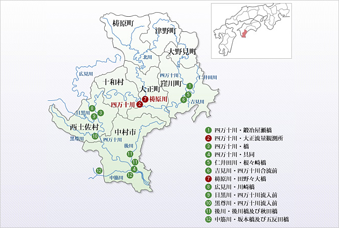 四万十川本流に4箇所、支流に8箇所、合わせて12箇所の調査地点があり、1年に4回この調査を実施しています。