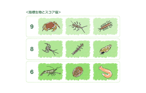 例えば、サワガニやカワゲラなどでは9、ヒゲナガカワトビケラやカワニナなどでは8、ヒラタドロムシやプラナリアなどでは6、など、それぞれの生物にスコア値が設定されていて、この値が高ければ高いほどその生物が棲む川はキレイであるとされています。