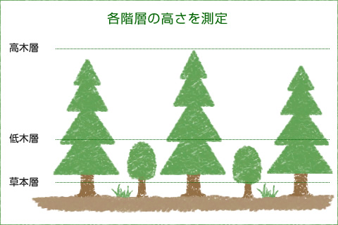 ■ 植被率・・・枝や葉が地表を覆っている割合を、各階層ごとに測定します。